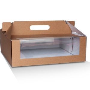 - Pack’N’Carry kraft cardboard cake box with 2 PET viewing windows, carry handle and white inside. Flat packed.